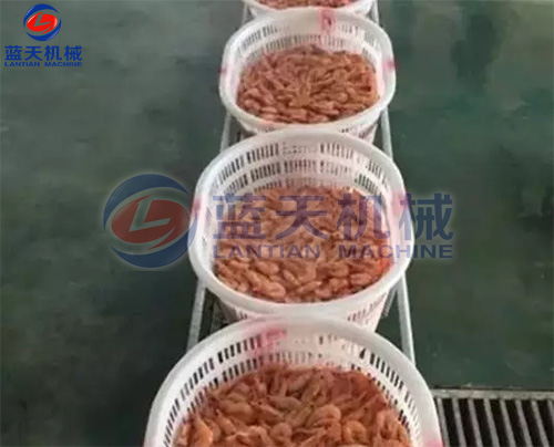 1、蒸煮后的蝦可帶殼烘干,也可剝殼對蝦仁進行烘干。將煮好的海蝦瀝干水分后,均勻地攤在烘盤上,裝進物料車,然后送入海蝦烘干房。