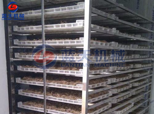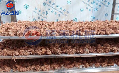2:先將采收的文山三七挑選裝盤,使用不銹鋼托盤、合理均勻?qū)⑷邤[放至托盤架中,每層間隔約為10厘米至15厘米,不宜鋪放太多,擺放以通風(fēng)透氣為佳,這樣每一層三七都能均勻受熱、干燥脫水。