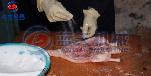 鴨只屠殺之前應(yīng)予12~24小時(shí)絕食,并給以充分清水,使之安靜休息。如此可使屠殺放血良好,并可減少未完全消化的飼料污染屠體的機(jī)會(huì)。經(jīng)屠殺后,將屠體外表洗凈,祛除余毛,并應(yīng)即速冷卻。鴨之屠體選用無(wú)骨折及瘀血斑點(diǎn)者,并將鴨只在肘關(guān)節(jié)及跗關(guān)節(jié)下端分別將兩翅及兩腳去掉。以左手抓住鴨之下額骨,右手持刀從口腔割掉帶舌的下額部,此處理俗稱(chēng)割外五件。