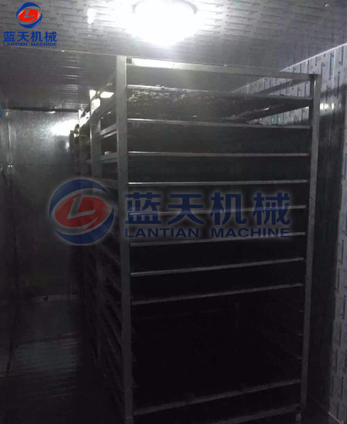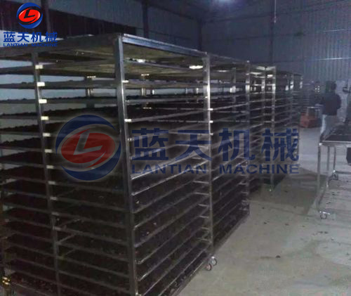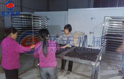 桑葚裝盤:使用桑葚烘干機(jī)干燥處理,時(shí)間要18個(gè)小時(shí)就可以干燥處理完了。一般每4公斤鮮桑葚可制成1公斤桑葚干。將經(jīng)整理去雜后的桑葚裝篩子,裝入物料車內(nèi)。每臺(tái)物料車不宜超過(guò)14個(gè)篩子,篩子層間距控制在10公分左右。以10P機(jī)為例,不要超過(guò)10臺(tái)物料車,以保證烘干房?jī)?nèi)有合理間隙位,利于熱風(fēng)通過(guò)。