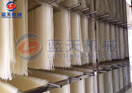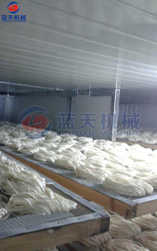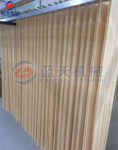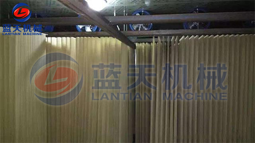 有些掛面容易在烘干過程中容易斷,有些不容易斷(玉米淀粉有幫助!),有些不能耐受溫度,溫度一高就容易斷,如果用太陽曬的話,盛夏上午10點(diǎn)鐘的太陽就能把掛面曬斷。有些溫度可以高一些。有些掛面一定要大量的風(fēng)量,否則中間的掛面就酸掉了!面條烘干機(jī)系統(tǒng)設(shè)計中非常重要的環(huán)節(jié)就是風(fēng)路設(shè)計,對于大部分掛面的烘干來說,使用頂出風(fēng)機(jī)組再結(jié)合上下風(fēng)路更利于風(fēng)路循環(huán),更利于面條的烘干。