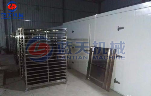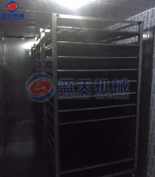1)將木耳或云耳一層層均勻擺放至特氟龍材質(zhì)的托盤后,放入不銹鋼物料車,推入木耳烘干房,木耳烘干時的溫度應從35℃開始,如果溫度過高,排濕跟不上,容易引起木耳變形。