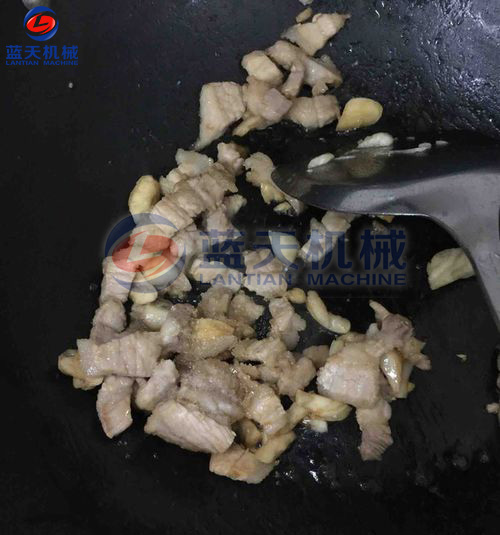 鍋上火,倒入肉塊,精鹽炒制20-30分鐘,加入白糖,再炒制20-30分鐘,加入白酒、醬油,炒到湯干即可出鍋。