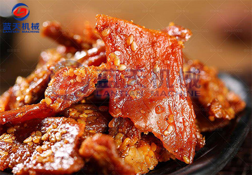 將出鍋的肉塊,置于不銹鋼網(wǎng)盤(pán)中或吊掛于烘烤推車上,然后推進(jìn)烘房?jī)?nèi)烘烤,溫度為45-60℃,烘烤時(shí)間為3-4小時(shí),即為豬肉干。