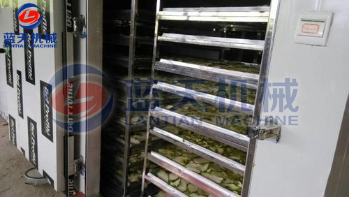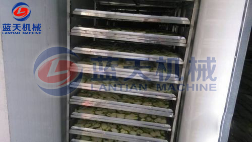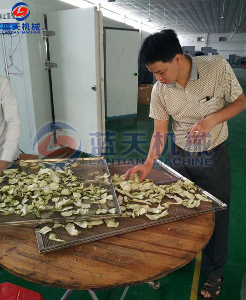 將切片好的佛手片放置于物料車托盤,注意堆放厚度不要超過3CM,這樣有助于烘房內(nèi)平流風對整個物料的烘干效果保持一致性。