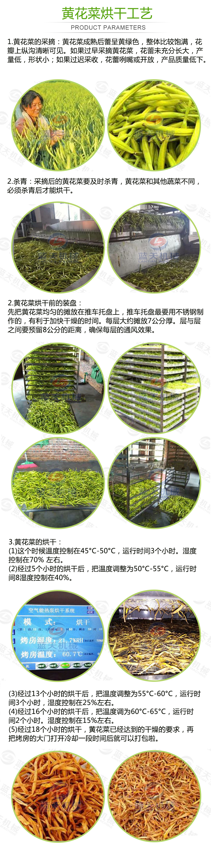 尾末的一段時(shí)間的烘干過程,要注意觀察黃花菜排水及干燥的程度,可根據(jù)干燥情況,繼續(xù)升高溫度,再烘干4小時(shí)左右,然后結(jié)束整個烘干流程。