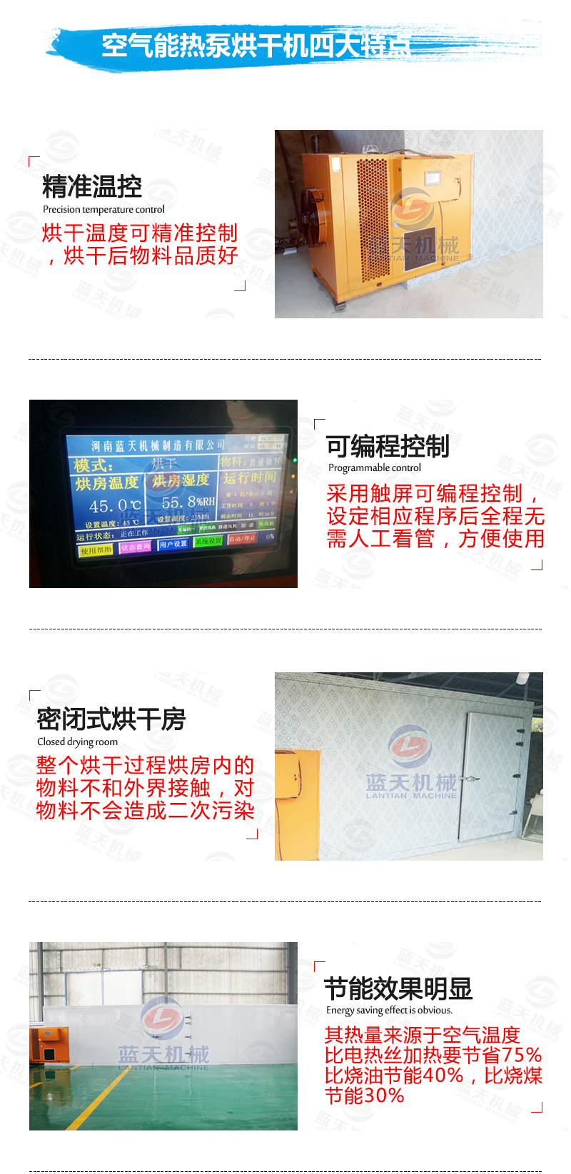 空氣能熱泵烘干設(shè)備有哪些功能?標(biāo)配的功能有烘干、除濕、排濕、冷干、四效熱回收、觸摸屏控制、可編程(分10個(gè)時(shí)段)