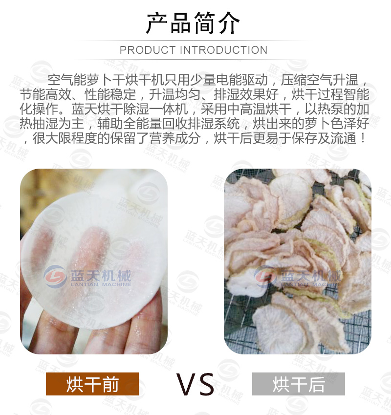 蘿卜干是一種風味、具有悠久歷史的食品。傳統蘿卜干加工采用是風脫水的方法,利用日照和風力,加速蘿卜的蒸騰作用,使蘿卜大量脫水,并利用鹽的高滲透壓來保存。我們介紹一種基于空氣能技術熱風烘干的蘿卜干烘干機代替日曬來加工蘿卜干,加快蘿卜干加工過程。